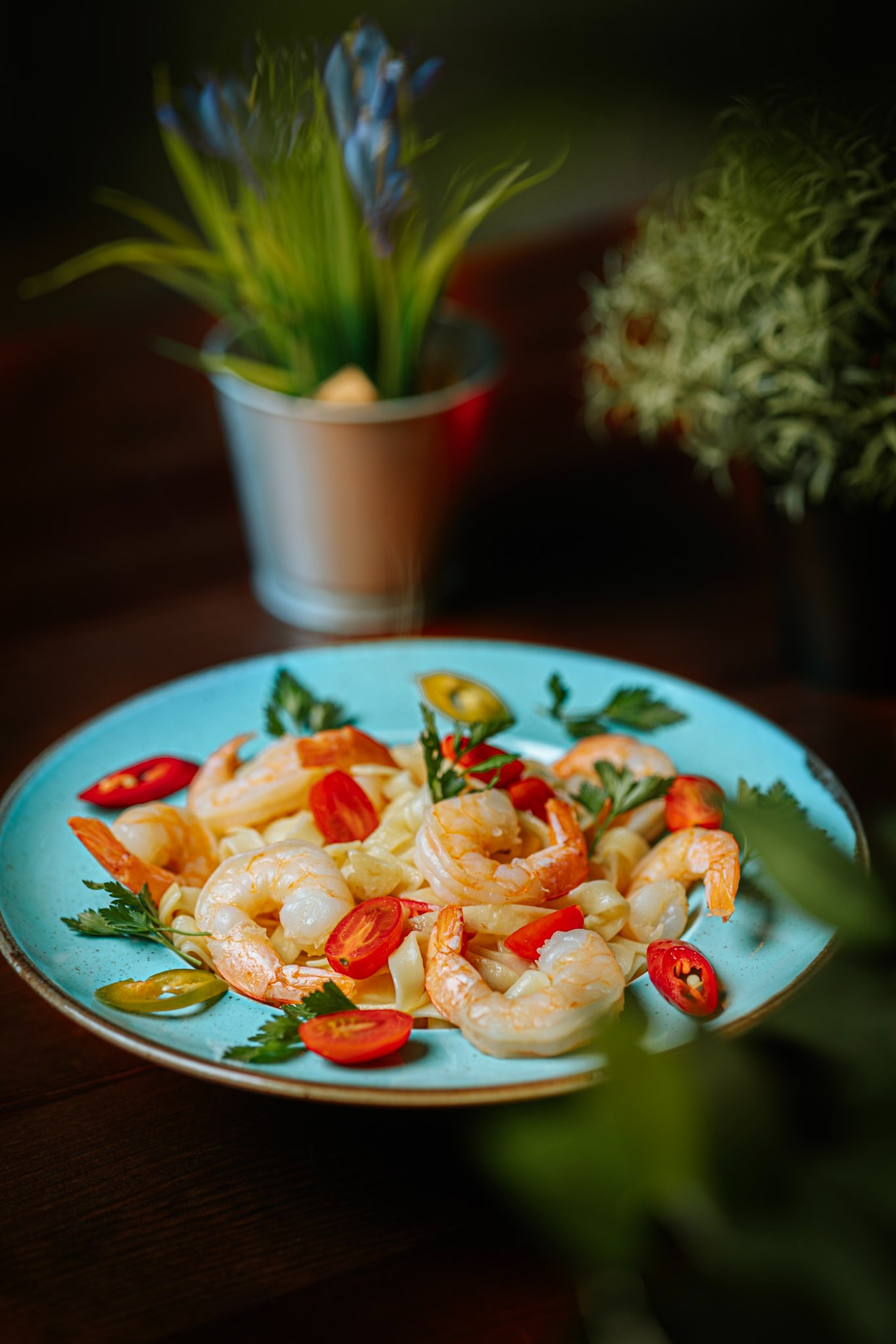 Makaron Tagliatelle z krewetkami w sosie koktajlowym