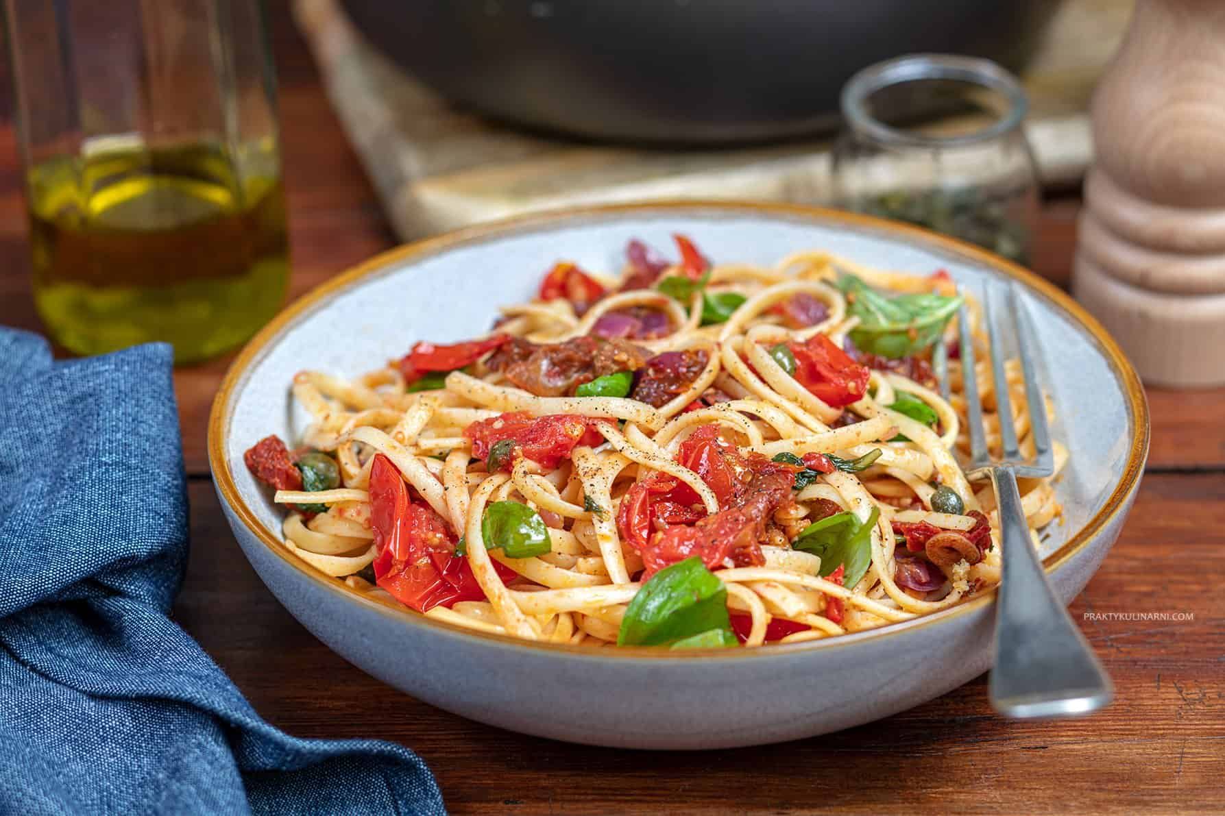 z cukinią, oliwkami i suszonymi pomidorami , na bazie oliwy i parmezanu -